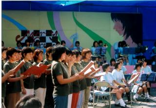 吹奏楽部とのジョイント演奏となりました。 昨年の「葉っぱのフレディ」と二年続けての蕨高祭参加の経緯などは、 一番最後の木谷さんのレポートをご覧下さい。  |