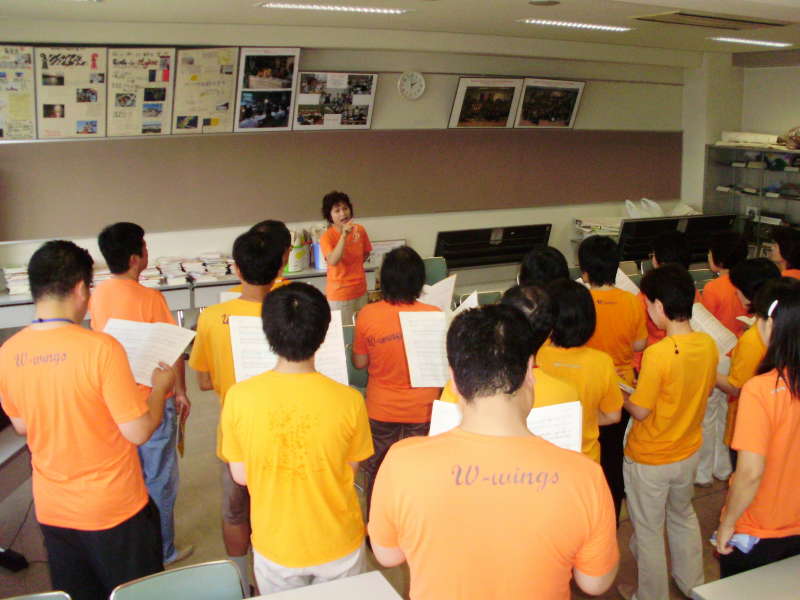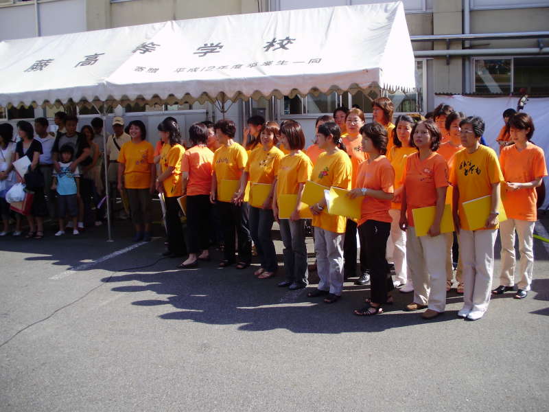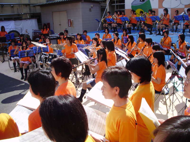 蕨高祭中庭ステージに今年もW-wingsが現れました。 このところ雨続きをはね返し、久々の夏空の下で演奏できました。 校歌 大地讃頌(だいちさんしょう) どんなときも ことしは、ブラスバンドと同じ燃えるオレンジ色です。 ブラスバンドの皆さん、暑い中の共演ありがとうございました。  |